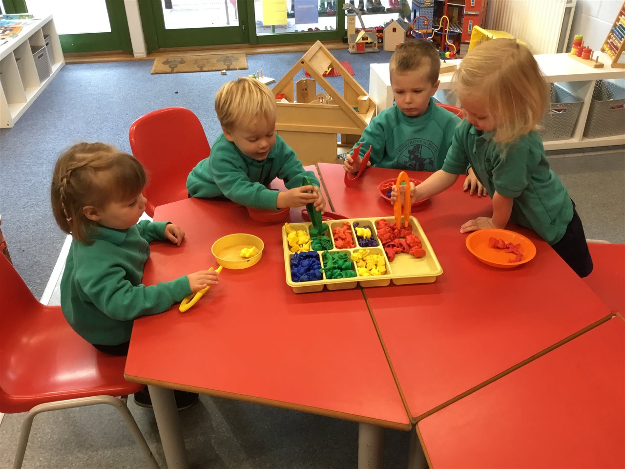 We have been using the pegs to move objects into our bowls, strengthening our hand muscles.